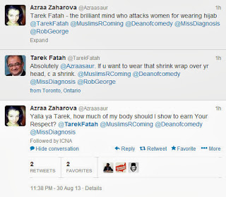 Canada's premier Islamophobe, Tarek Fatah, is out and about on his usual unrestrained behavior. On August 30, 2013 Tweeter Azraa Zaharova writes,